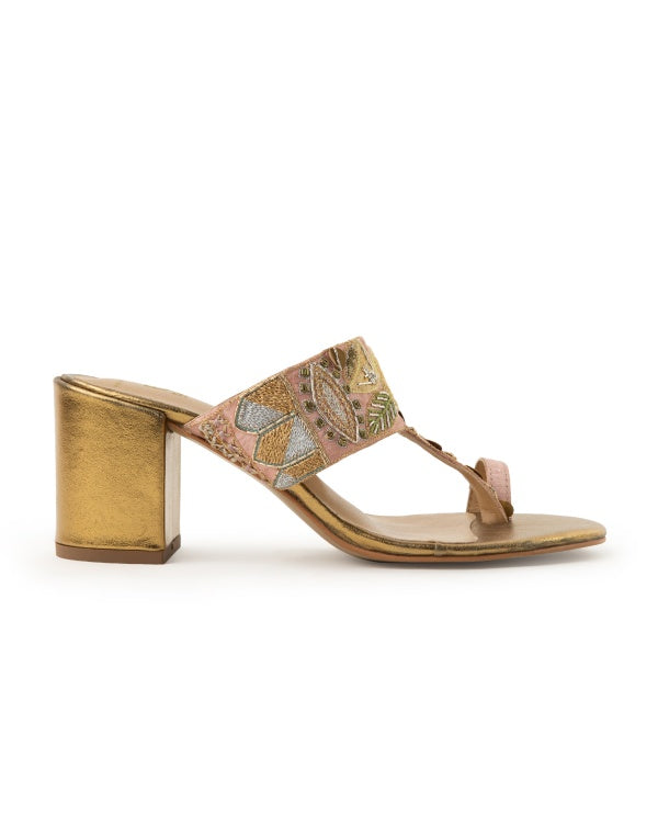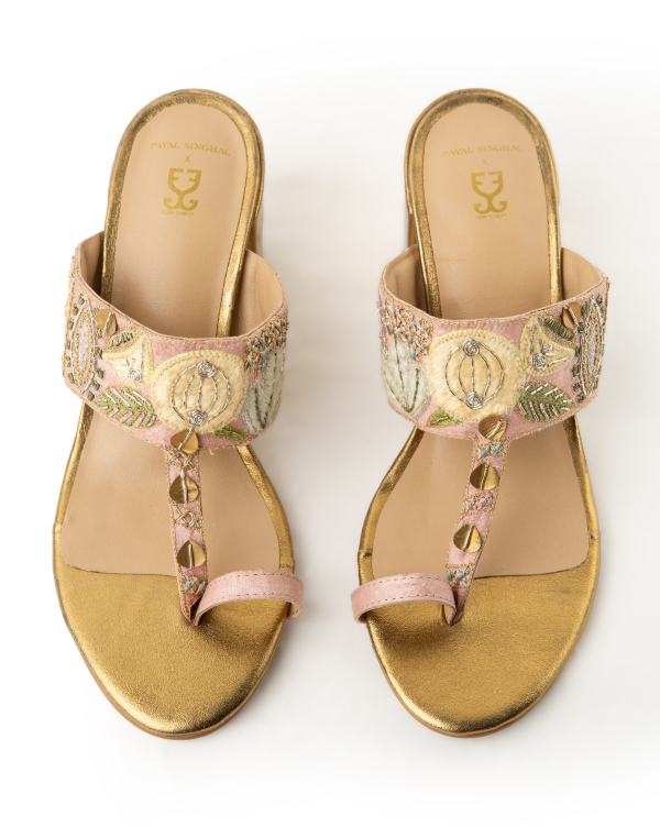 Redefine your festive style with a pair that’s unique, crafted for celebrations, and can add a pop of brightness to your style. With embellished leaves and gold-toned accents, these kolha block heels can elevate your pastel outfits.