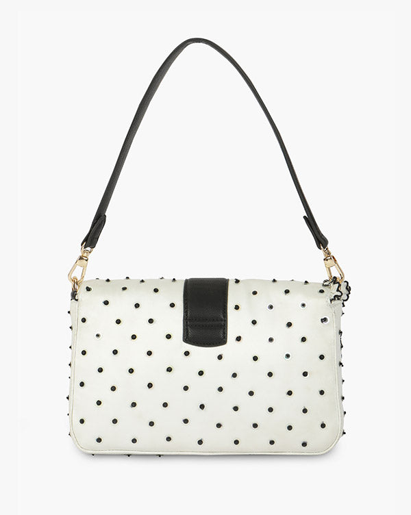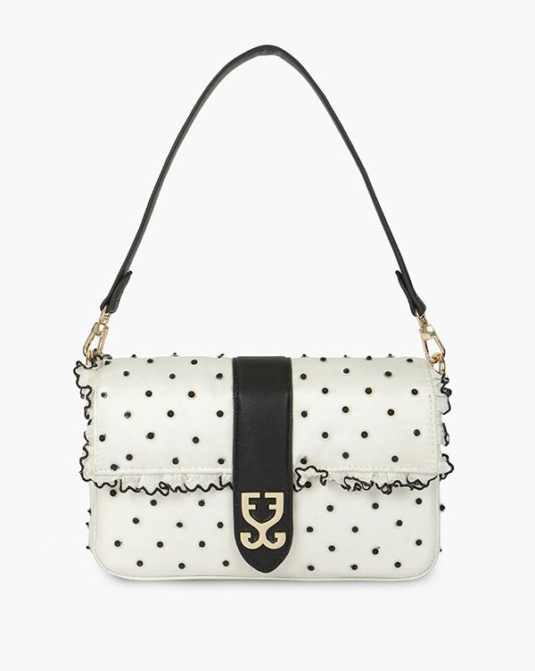 Retro charm meets modern flair in this white fabric bag, dotted with playful black polka-sequin embroidery. The black PU flap strap with subtle FG logo snap and gold-accented detachable handle add a touch of timeless sophistication, perfect for elevating any outfit with a hint of vintage whimsy.