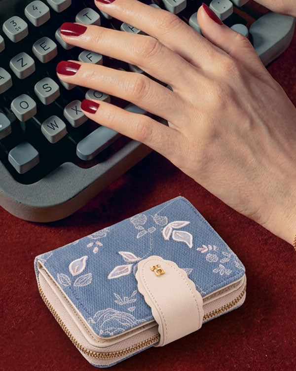 Charming and handcrafted, this blue denim wallet is detailed with all-over thread embroidery and hand-embroidered leaf appliqués at the top. Beige PU trimmings at the flap and wristlet add a soft contrast, while the flap is finished with a subtle FG logo. With a metal zipper and polysuede lining inside, it’s a playful yet timeless accessory.