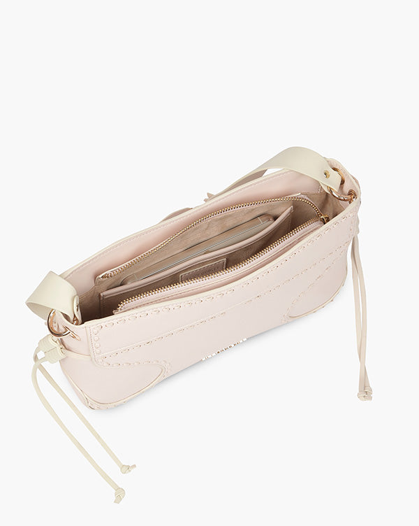 Soft blush tones meet elegant ivory contrasts in this effortlessly feminine shoulder bag. Defined by its interlaced detailing and clean edges, it carries a delicate charm, while the gold-toned Fizzy letter logo adds a subtle hint of shine. Light, graceful, and easy to style- perfect for everyday elegance.