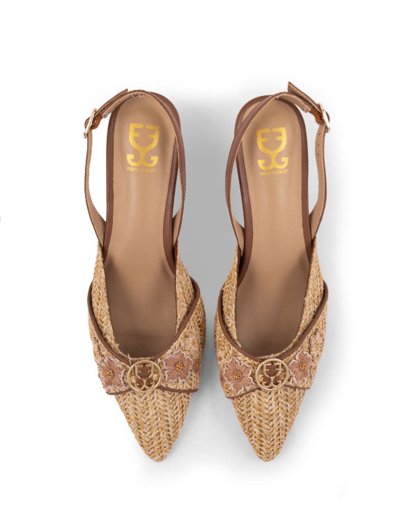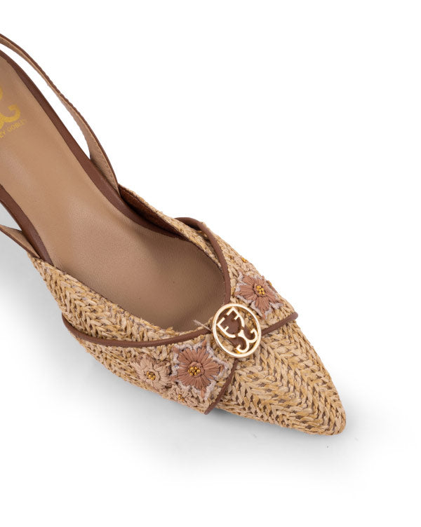 From our Neutrals collection, this slingback mule heel is designed to go with everything. Crafted on a beige raffia base, it features 3D raffia flowers accented with delicate metallic beads and subtle logo detailing. The textural interplay adds depth while keeping the palette versatile, making it an easy choice for both everyday styling and elevated occasions.