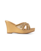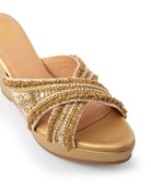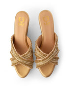 Step into royal tradition with modern flair. This dark gold criss-cross wedge heel is adorned with exquisite embroidery, blending heritage with contemporary style. Perfect for festive occasions. Pair it with classic lehengas or elegant shararas for a majestic finish.